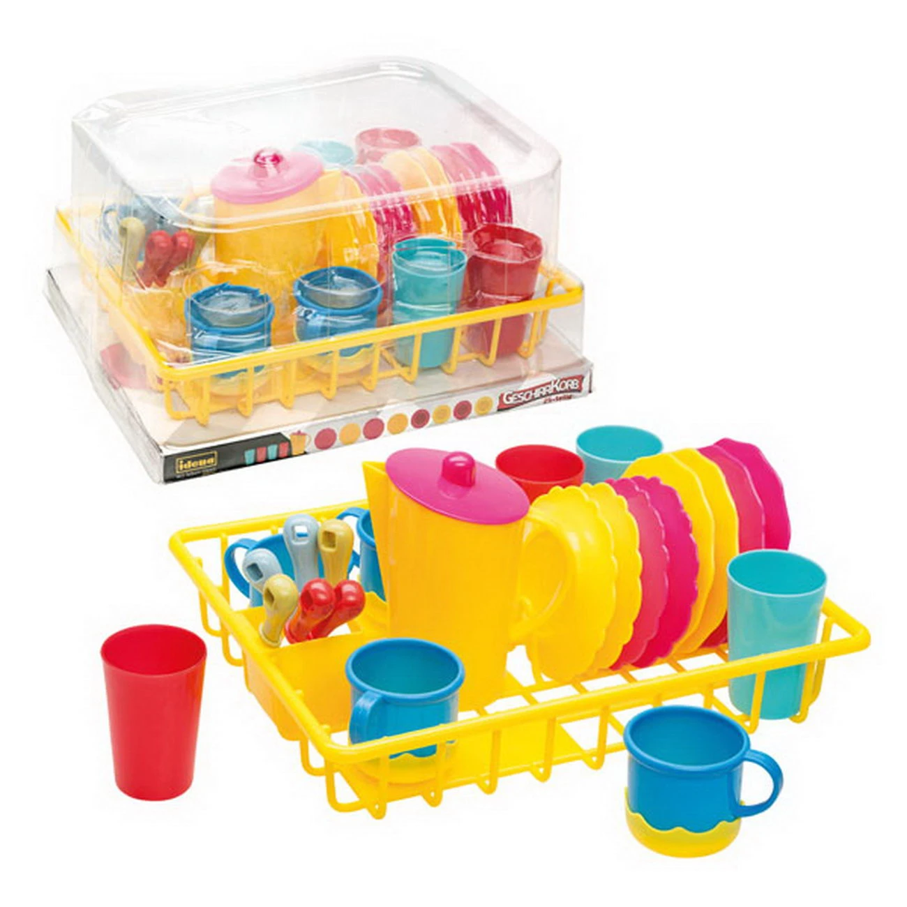Gelber Geschirrkorb / Abtropfkorb mit buntem Küchengeschirr aus Kunststoff für Spielküche oder Puppen Eltern.
