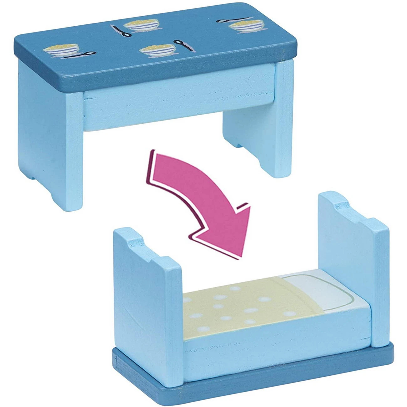 Das Set beinhaltet eine Peppa Holzfigur und viele Holzmöbel -sowie Bad, Backofen, Kühlschrank, TV, Sitzbank. Außerdem enthalten sind zwei Tische, die auf den Kopf gestellt und als Betten verwendet werden können. Die Kleinen können sie sogar stapeln, um Etagenbetten zu schaffen. Die Figur verfügt über Drop-n-Play-Füße, sodass sie leicht in die vorgesehene Sitzbank gesteckt werden kann und somit auch die Hand-Augen-Koordination fördert. Hergestellt aus umweltbewussten FSC®-zertifiziertem Holz.