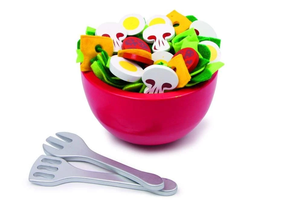 Wenn man mit der Kinderküche oder dem Kaufladen spielt, ist diese Salatschüssel eine schöne Ergänzung des Zubehörs. Die Schüssel besteht aus Holz und ist schön lackiert und besonders hochwertig. Das ist mal ein Spielzeug, das nicht nur den Kindern Freude bereitet, sondern auch die Erwachsenen begeistert.